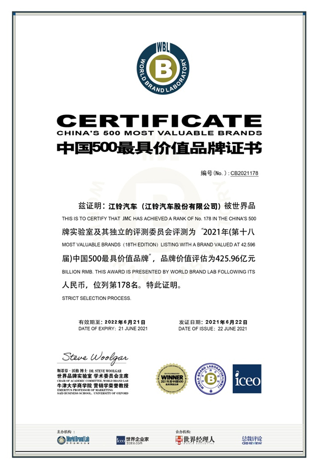 江鈴汽車(chē)股份有(yǒu)限公司被世界 品牌實驗室及其獨立的(de)評測委員(yuán)會(<¶☆huì)評測為(wèi)2021年(nián)(第十八屆)中國(guó)500 ÷最具價值品牌,品牌價值評估為(wèi)425.96億元人(rén)民(mín)币,位∞ 列第178名。